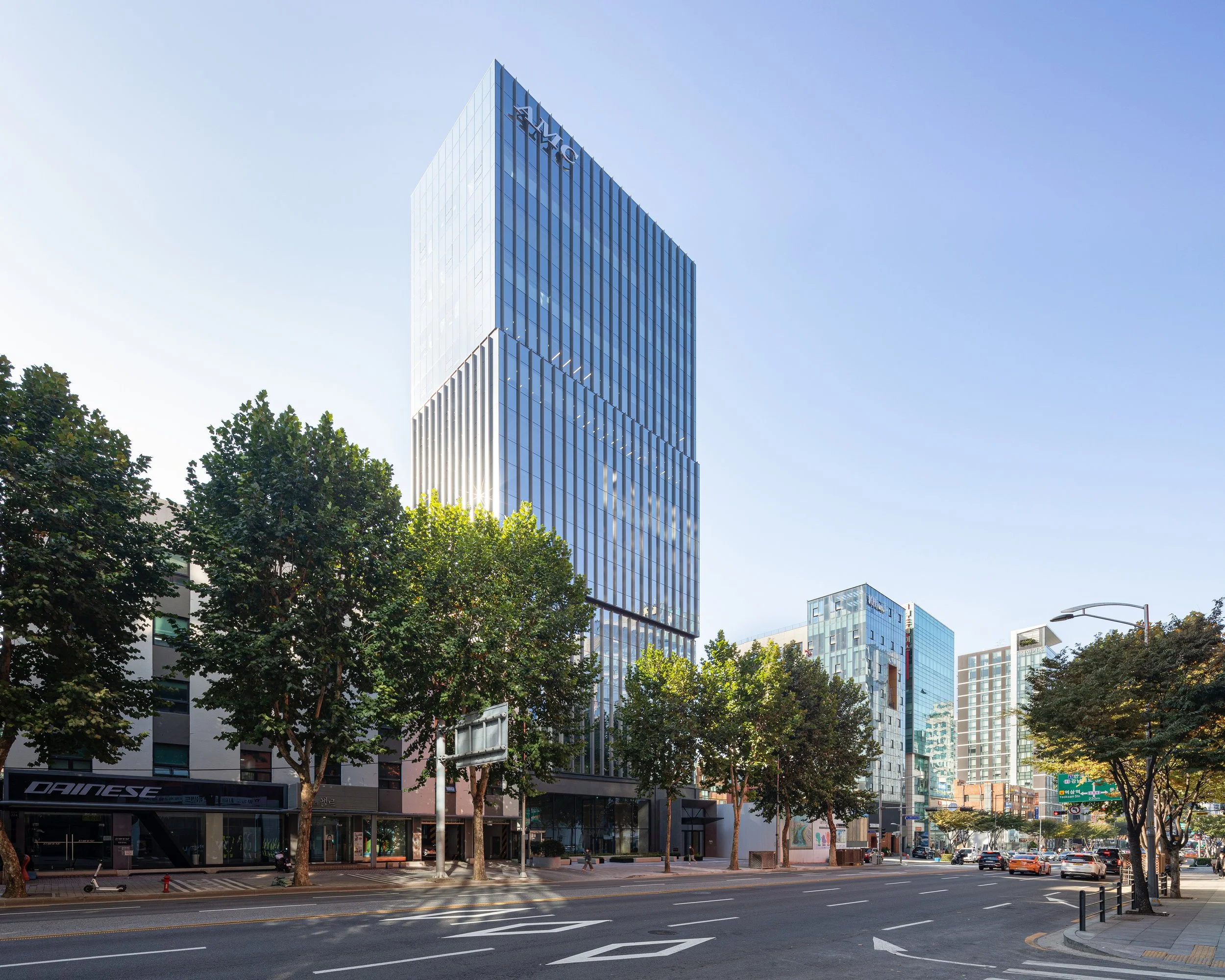 The AMC headquarters tower reflects the purpose and context of commercial development in the rapidly changing urban environment of Gangnam. It aimed to maximize commercial purposes while simultaneously securing open spaces seamlessly connected to the urban fabric. Located in Yeoksam-dong, Gangnam-gu, between Eonju subway station and the intersection of Gyeongbok apartments, the site is surrounded by various medium-sized buildings, including hospitals, offices, hotels, commercial and residential complexes, loosely clustered together. The L-shaped project site is directly adjacent to the commercial building at the corner. By separating the vehicle entryway on Bongeunsa-ro 34-gil, a secondary road, the façade of the new headquarter tower could be fully dedicated to pedestrians. 8m setback is applied to maximize open public space, creating an unusual scale of open space which hardly be found on Bongeunsa-ro. Such a unique open space is perceived by pedestrians as more prominent than the architecture itself. The open space on North side facing Bongeunsa-ro, featuring landscaping and benches to offer people a place to rest and interact, while guiding pedestrian flow towards the tower.
