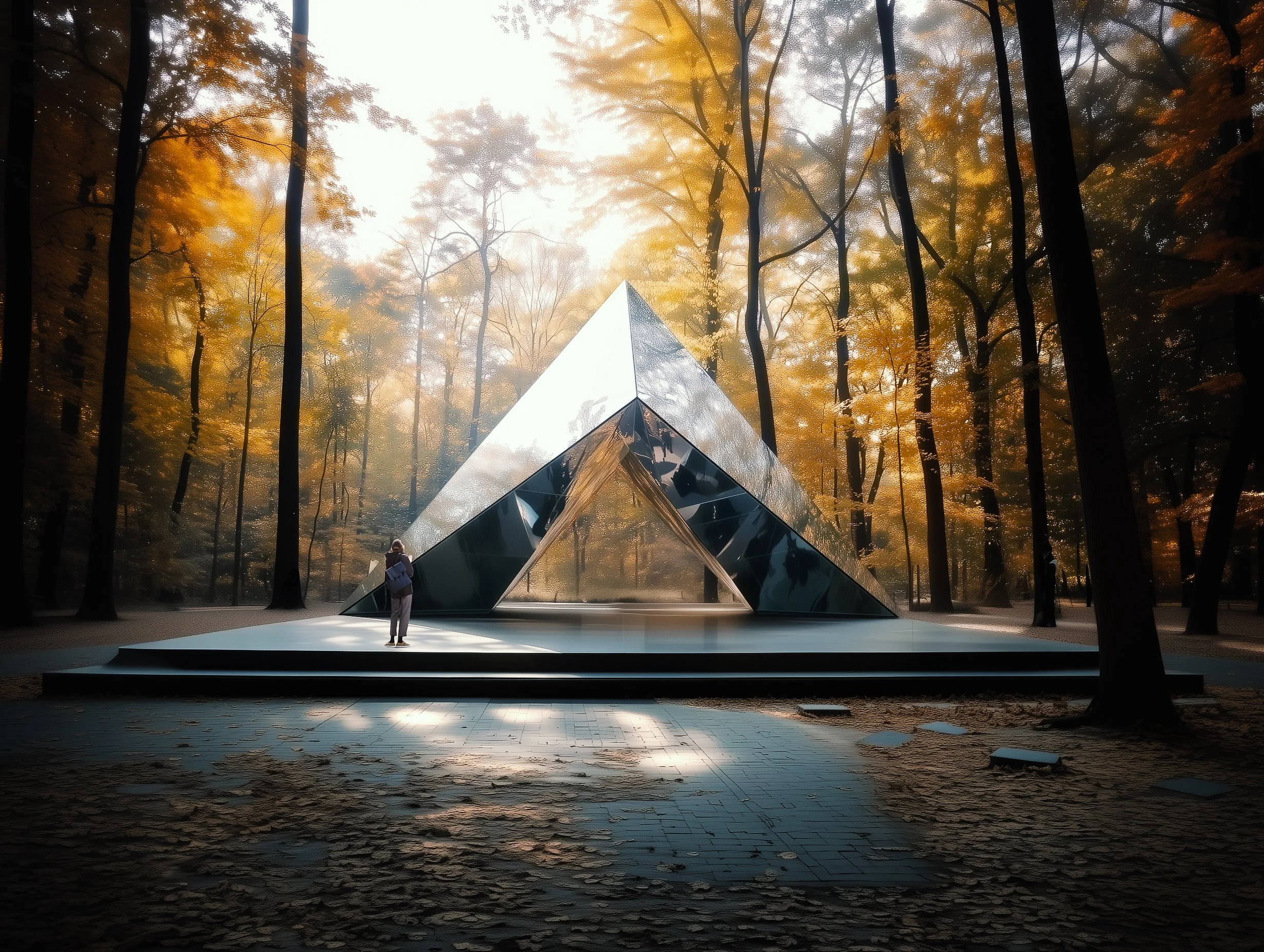 반사 표면은 숲의 수직적 밀도와 빛의 층위를 중첩시키며, 구조물의 물질성은 시각적으로 해체된다. 이는 기념비성이 더 이상 영속성과 물리적 무게에서 비롯되지 않고, 환경과의 관계 속에서 발생하는 경험적 강도에서 형성될 수 있음을 제안한다. 파빌리온은 주변 풍경을 증폭시키는 매개체로서, 자연의 스케일과 시간성을 내부로 끌어들이며 새로운 형태의 기념적 공간을 구성한다. 이러한 기념비성은 고정된 기억을 강요하기 보다, 방문자의 움직임과 시선, 계절과 빛의 변화에 따라 매번 새롭게 생성된다. 숲속의 반사 파빌리온은 자연과 인공, 대상과 배경, 영속성과 순간성 사이의 경계를 흐리며, 기념비를 ‘보는 것’이 아닌 ‘경험하는 것’으로 전환한다.