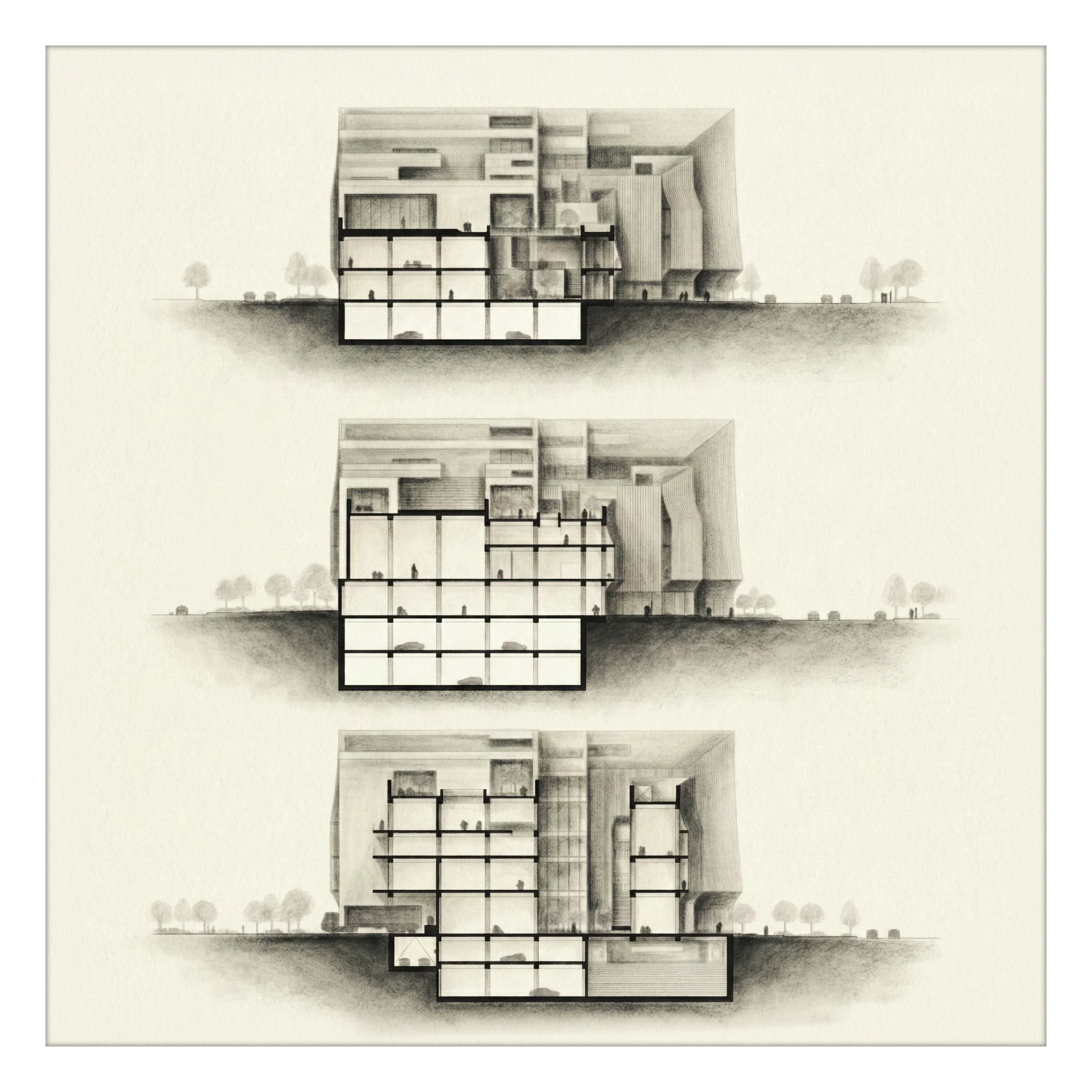 Responding to the site’s level change, a lowered entrance extends from the street, while pivot doors open the courtyard to blur inside and outside. A double skin of timber louvers and glass modulates daylight and glows warmly at night. The section progresses from an open civic platform below to contemplative spaces above, adapting to evolving modes of knowledge. Within the vertical city, it unfolds a horizontal forest that refines the urban grain and connects people.