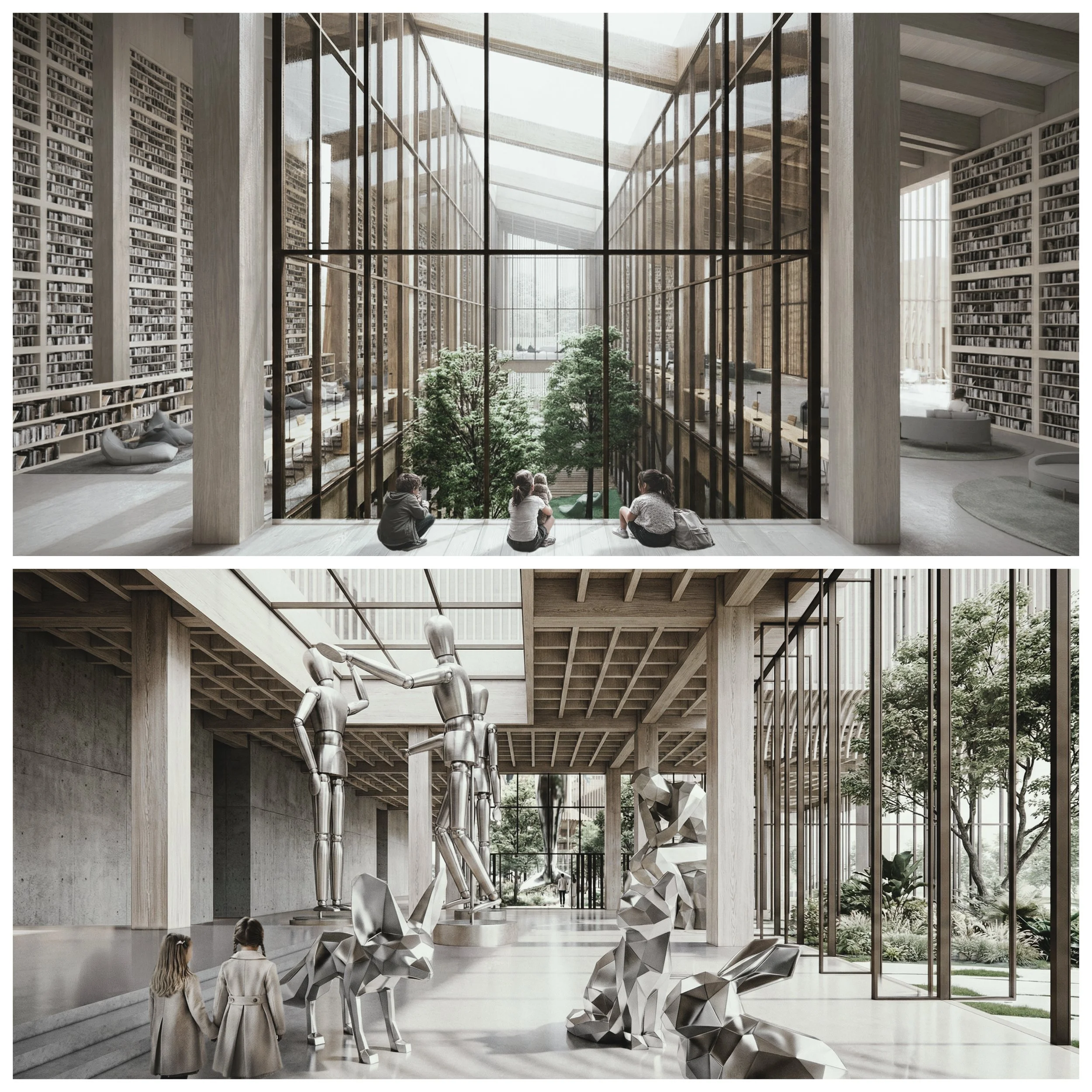At the heart of a vibrant residential community beside local schools, this library operates as a hybrid platform integrating GLAM. Knowledge moves beyond storage to be produced, shared, exhibited, and reinterpreted. Within a dense high-rise context, the building extends low and wide rather than competing vertically, its layered timber softening the concrete forest. Not a monument, it becomes a permeable “forest of knowledge” — an open civic ground for everyday life.