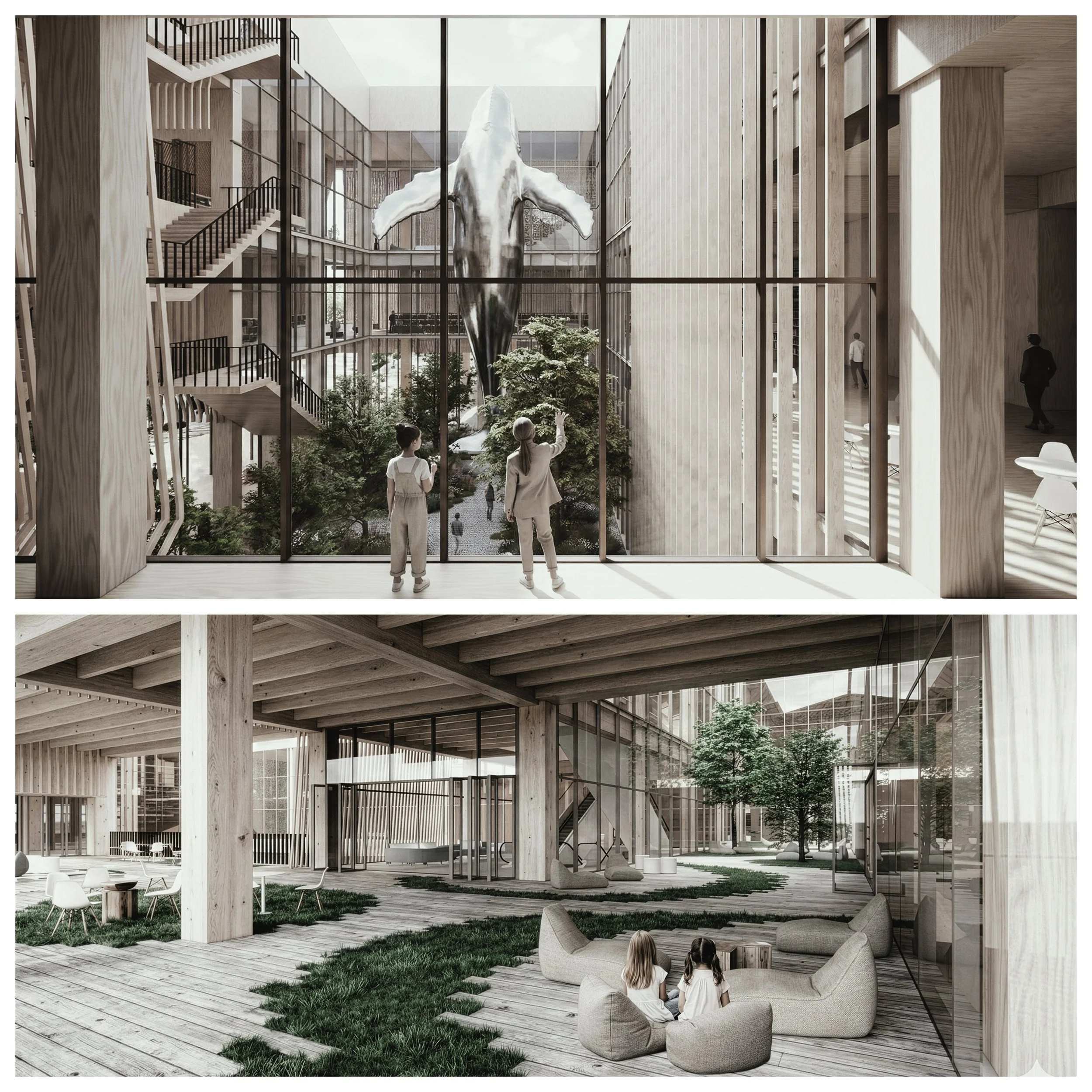 The CLT and glulam frame serves as structure, space, and finish. Light filters between exposed columns and beams, diffusing along the grain to create tactile depth. Interlocking volumes gather around a courtyard that draws in light, buffers noise, and forms a civic heart linking city and interior. Crossing stairs and bridges choreograph pause and movement, turning the library into a spatial journey.