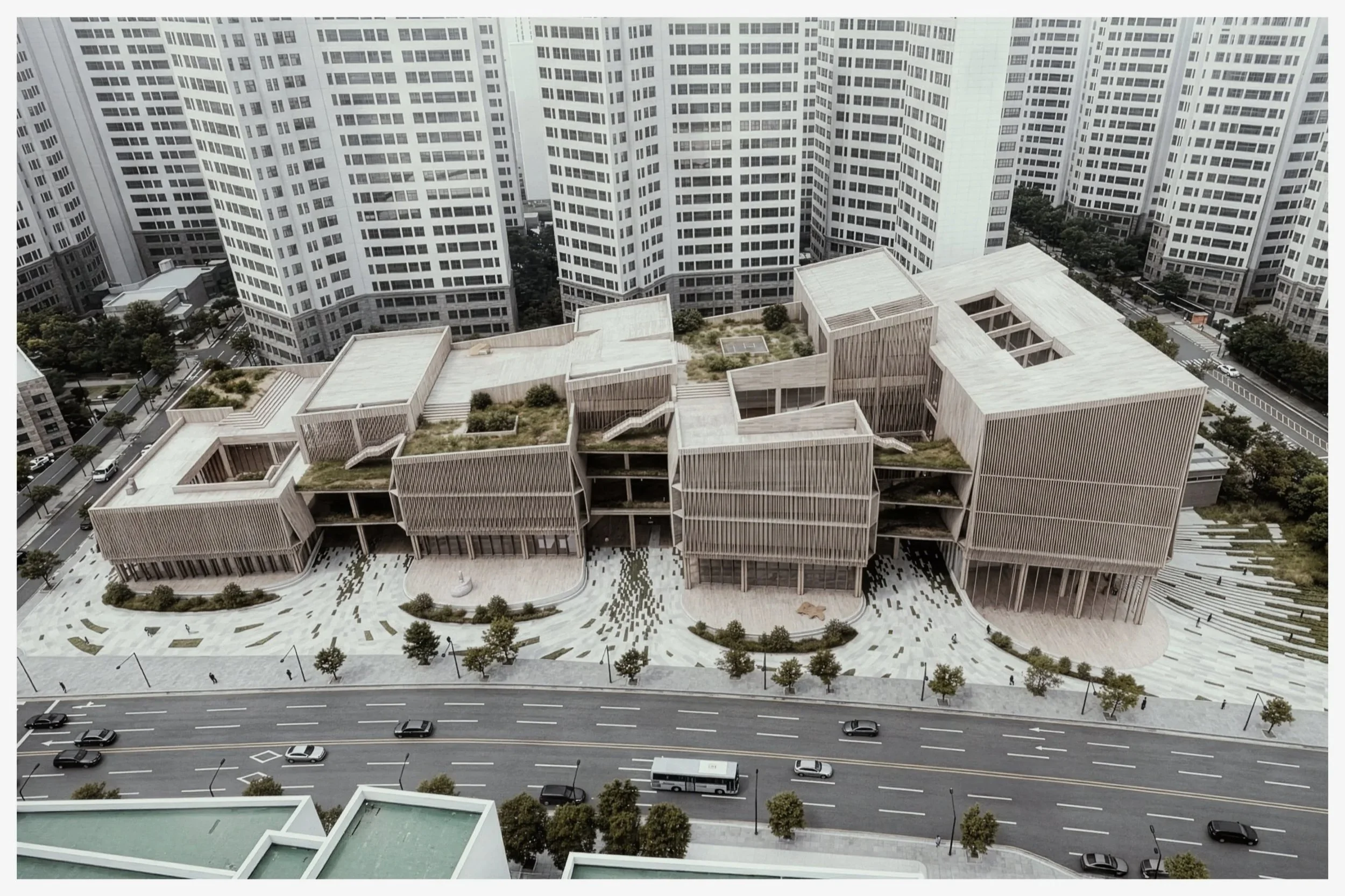 대지의 고저 차를 수용한 낮은 진입부는 가로와 자연스럽게 이어지고, 피봇 도어로 확장되는 중정은 실내외 경계를 흐린다. 목재 루버와 유리의 이중 외피는 빛을 조절하고 밤에는 온기를 드러낸다. 지상층의 열린 플랫폼에서 상부의 사색 공간으로 이어지는 단면은 변화하는 지식 환경에 유연하게 대응한다. 수직의 도시 속에 수평의 숲을 펼쳐 도시의 결을 다듬고 사람을 잇는 플랫폼이 된다.