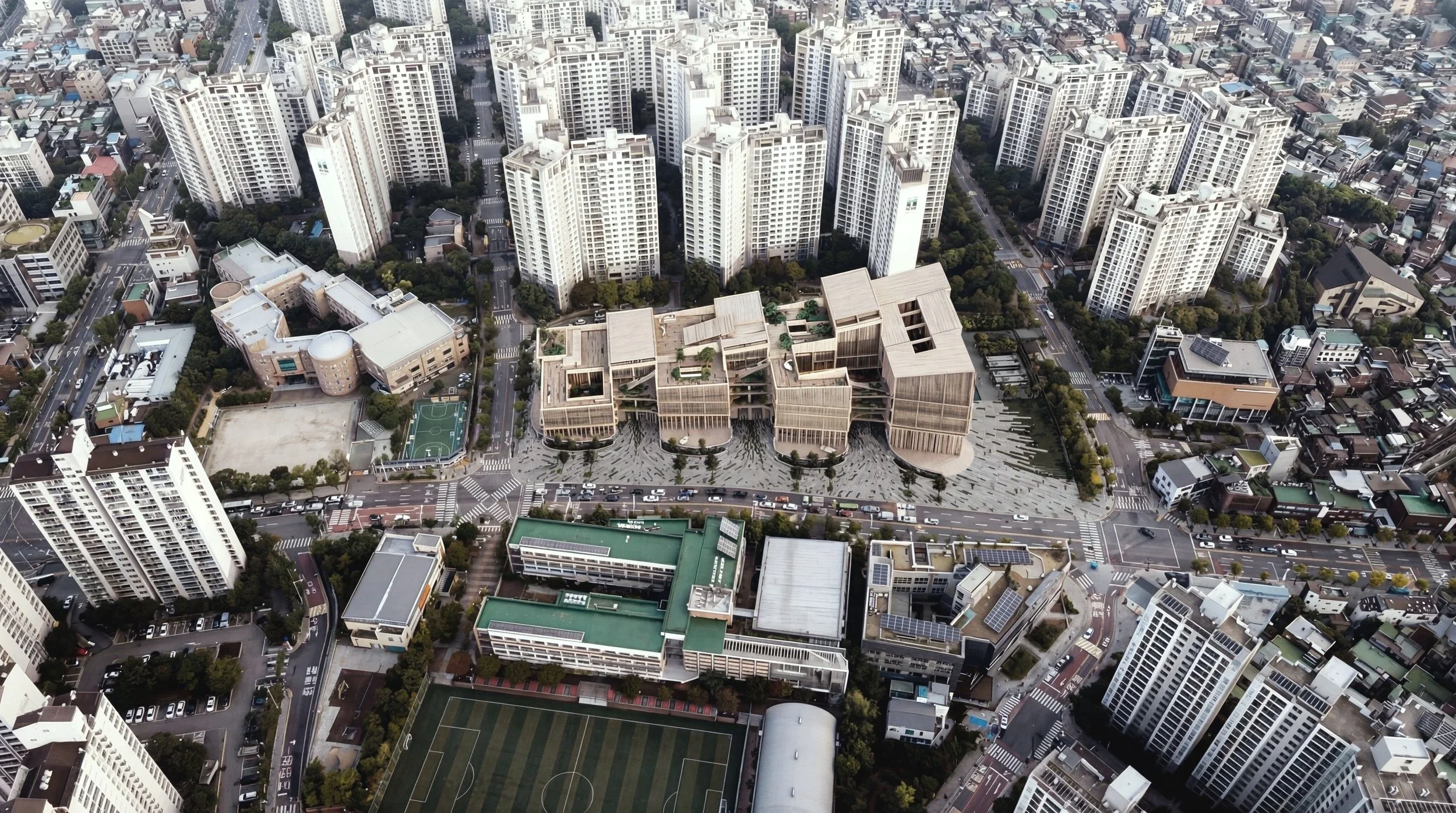 활기찬 주거 커뮤니티의 중심, 초·중학교와 맞닿은 대지 위에 자리한 이 도서관은 GLAM 개념을 통합한 복합 문화 플랫폼이다. 이곳에서 지식은 저장을 넘어 생산·공유·전시되며 재해석되고, 건축은 이러한 확장된 공공성을 공간으로 번역한다. 고밀도 아파트가 수직으로 솟은 도시 맥락 속에서 건물은 경쟁적으로 상승하기보다 낮고 넓게 펼쳐지며, 적층된 목재의 결로 콘크리트 숲의 긴장을 완화한다. 기념비적 오브제가 아닌, 일상에 스며드는 ‘지식의 숲’이자 발길이 머무는 열린 공공의 마당이다.