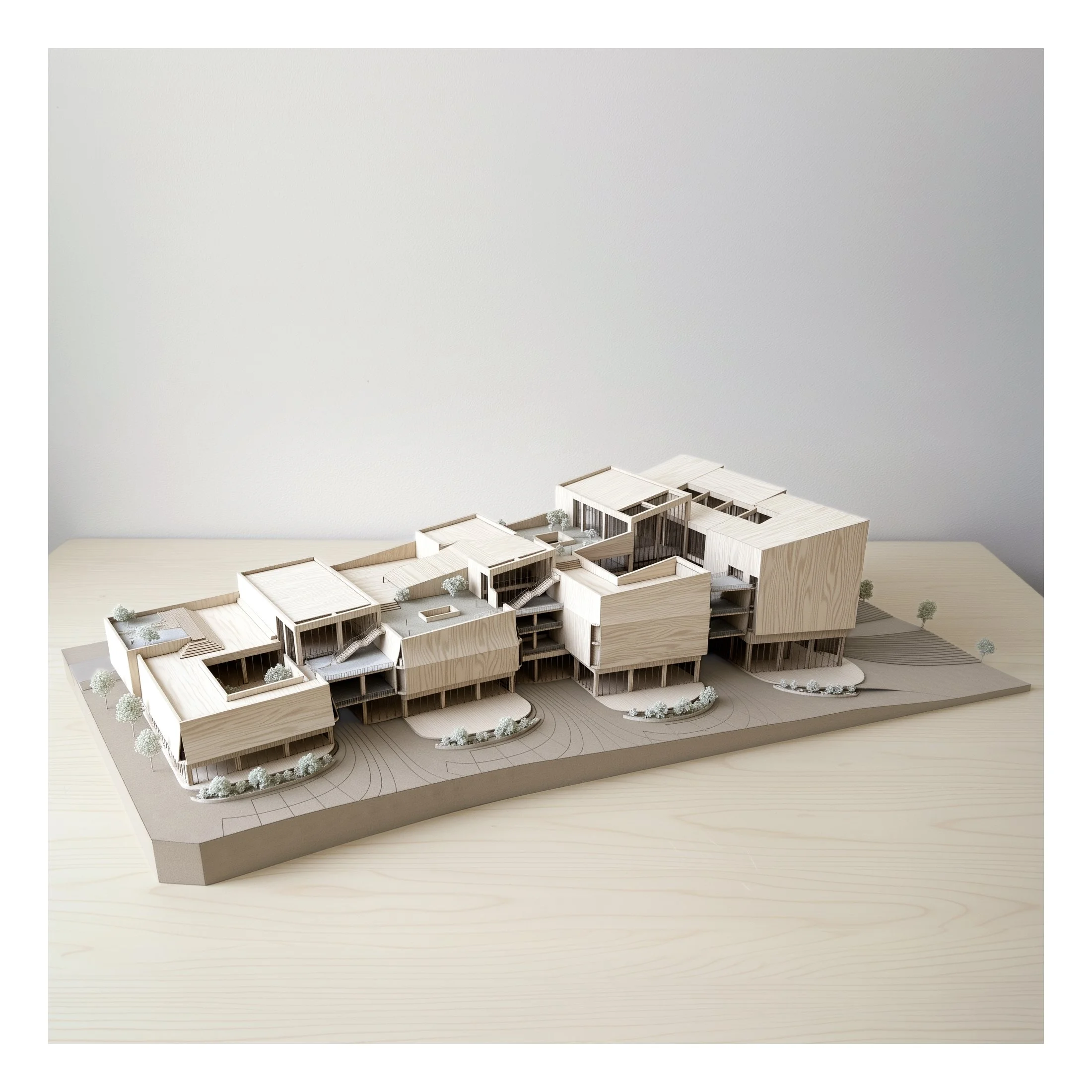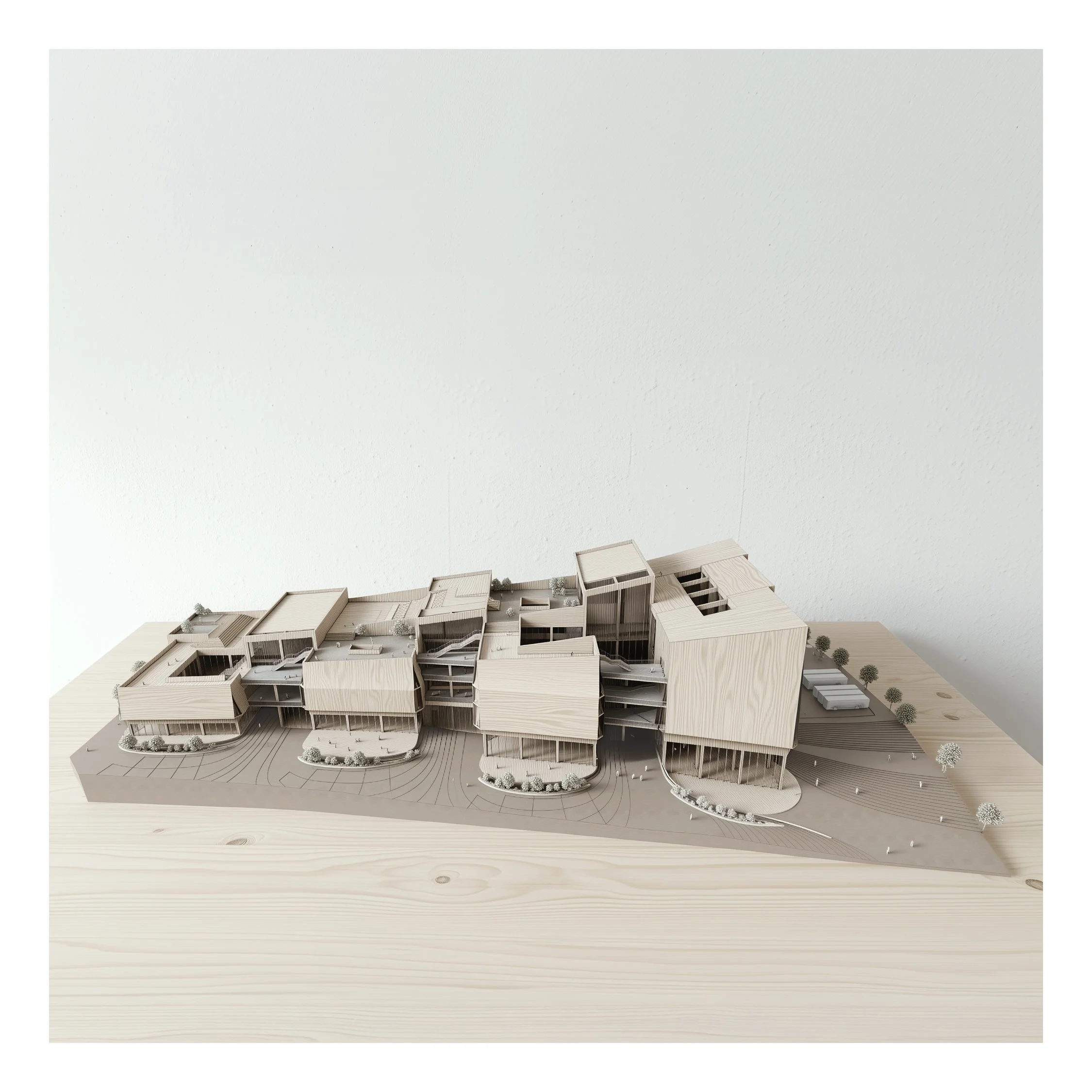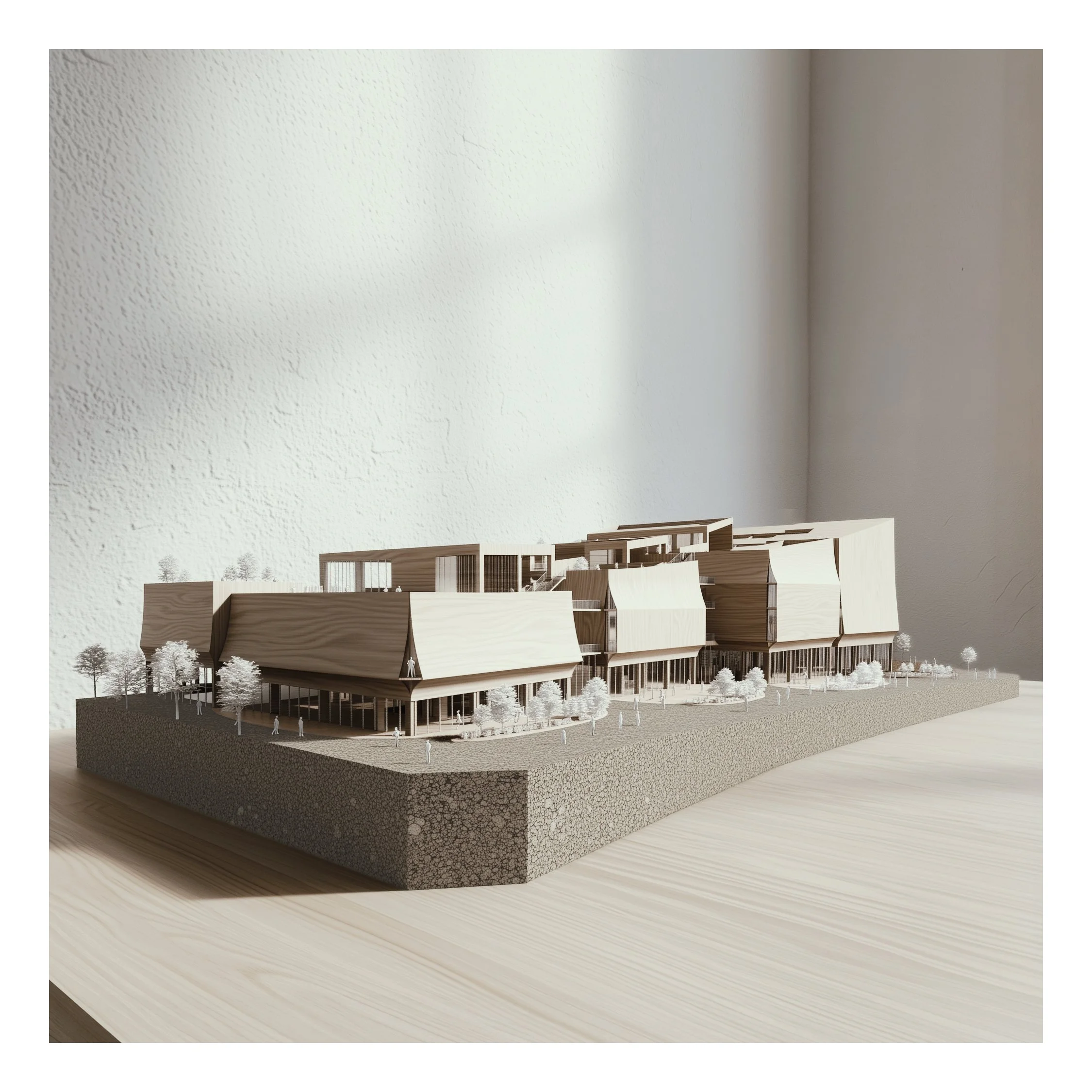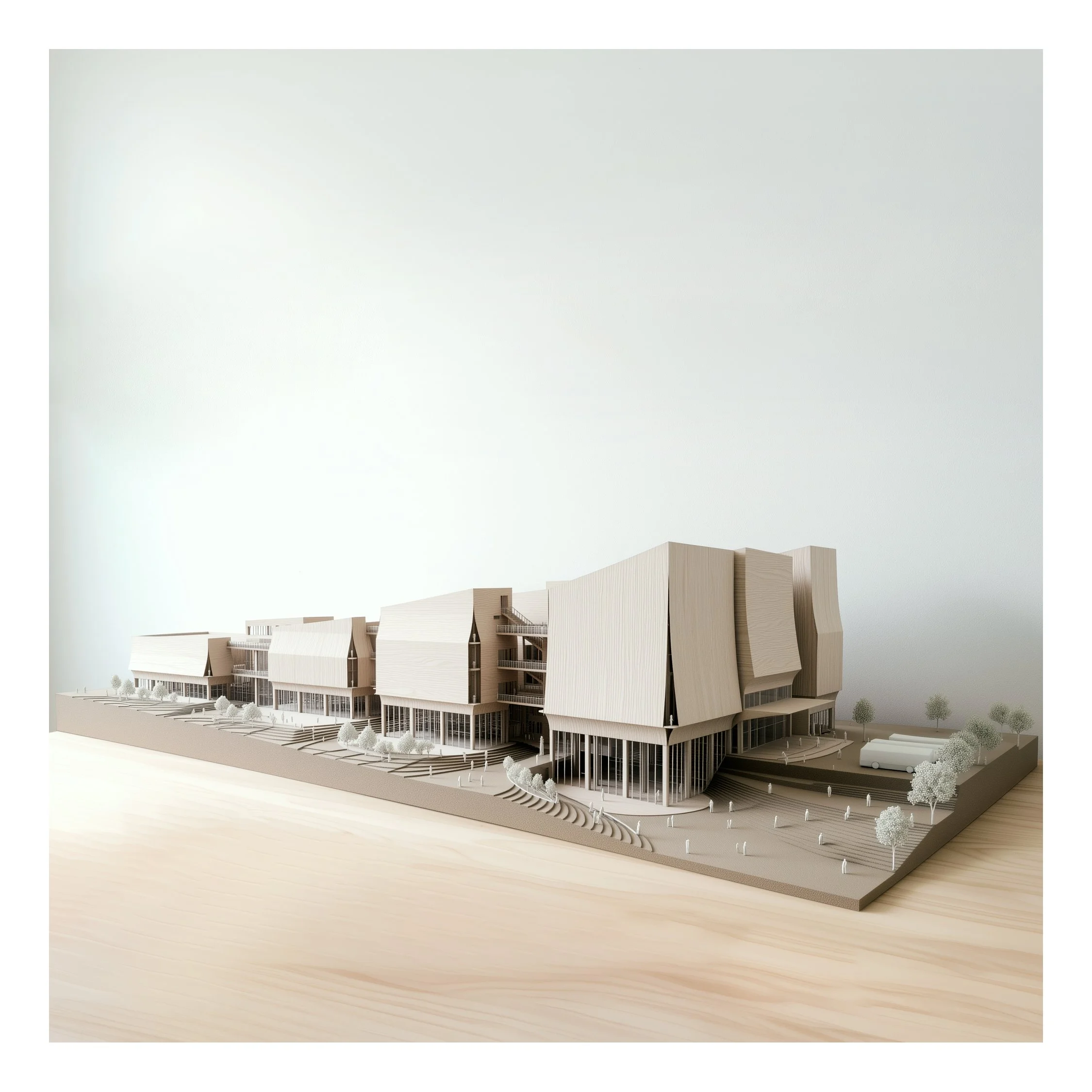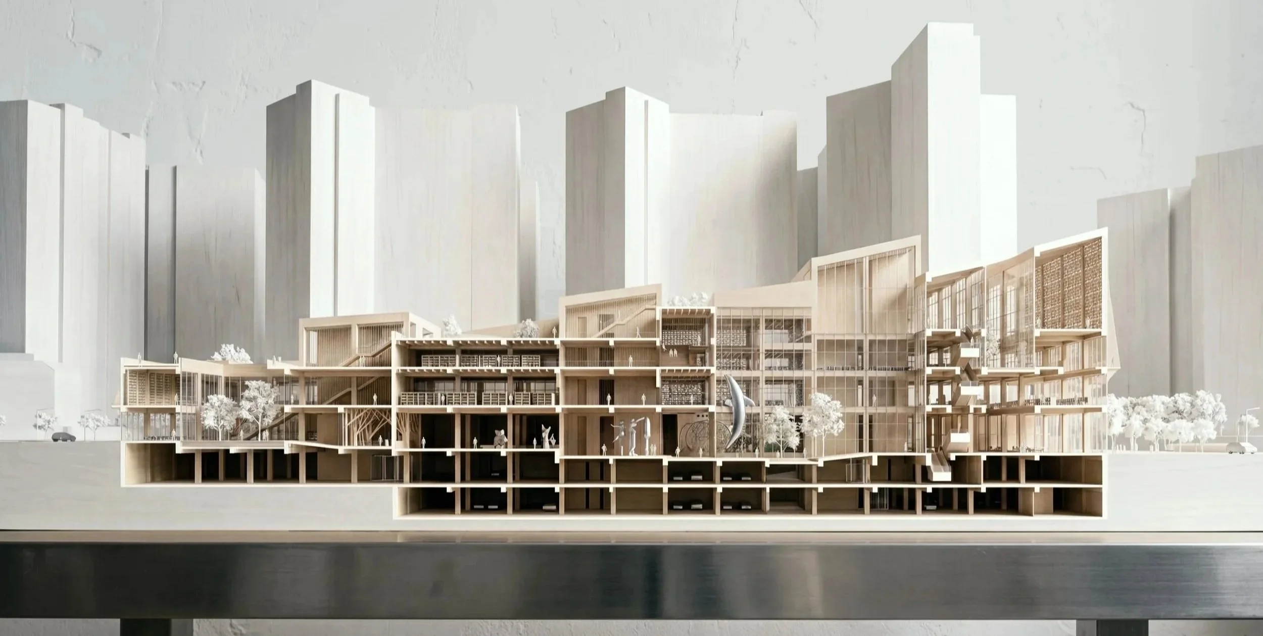 At the heart of a vibrant residential community beside local schools, this library operates as a hybrid platform integrating GLAM. Knowledge moves beyond storage to be produced, shared, exhibited, and reinterpreted. Within a dense high-rise context, the building extends low and wide rather than competing vertically, its layered timber softening the concrete forest. Not a monument, it becomes a permeable “forest of knowledge” — an open civic ground for everyday life.