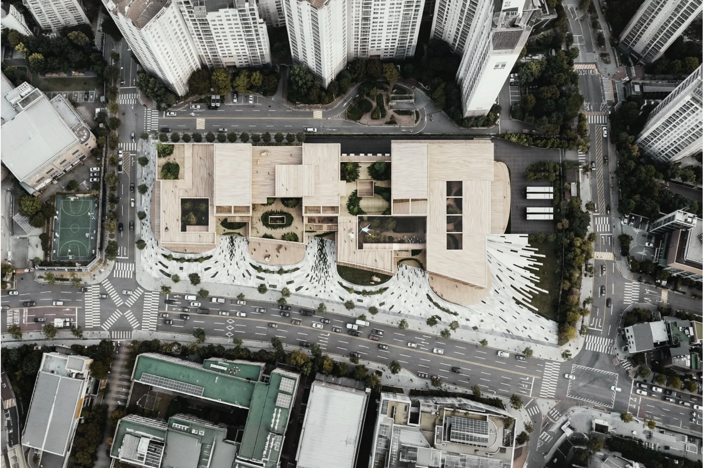 대지의 고저 차를 수용한 낮은 진입부는 가로와 자연스럽게 이어지고, 피봇 도어로 확장되는 중정은 실내외 경계를 흐린다. 목재 루버와 유리의 이중 외피는 빛을 조절하고 밤에는 온기를 드러낸다. 지상층의 열린 플랫폼에서 상부의 사색 공간으로 이어지는 단면은 변화하는 지식 환경에 유연하게 대응한다. 수직의 도시 속에 수평의 숲을 펼쳐 도시의 결을 다듬고 사람을 잇는 플랫폼이 된다.