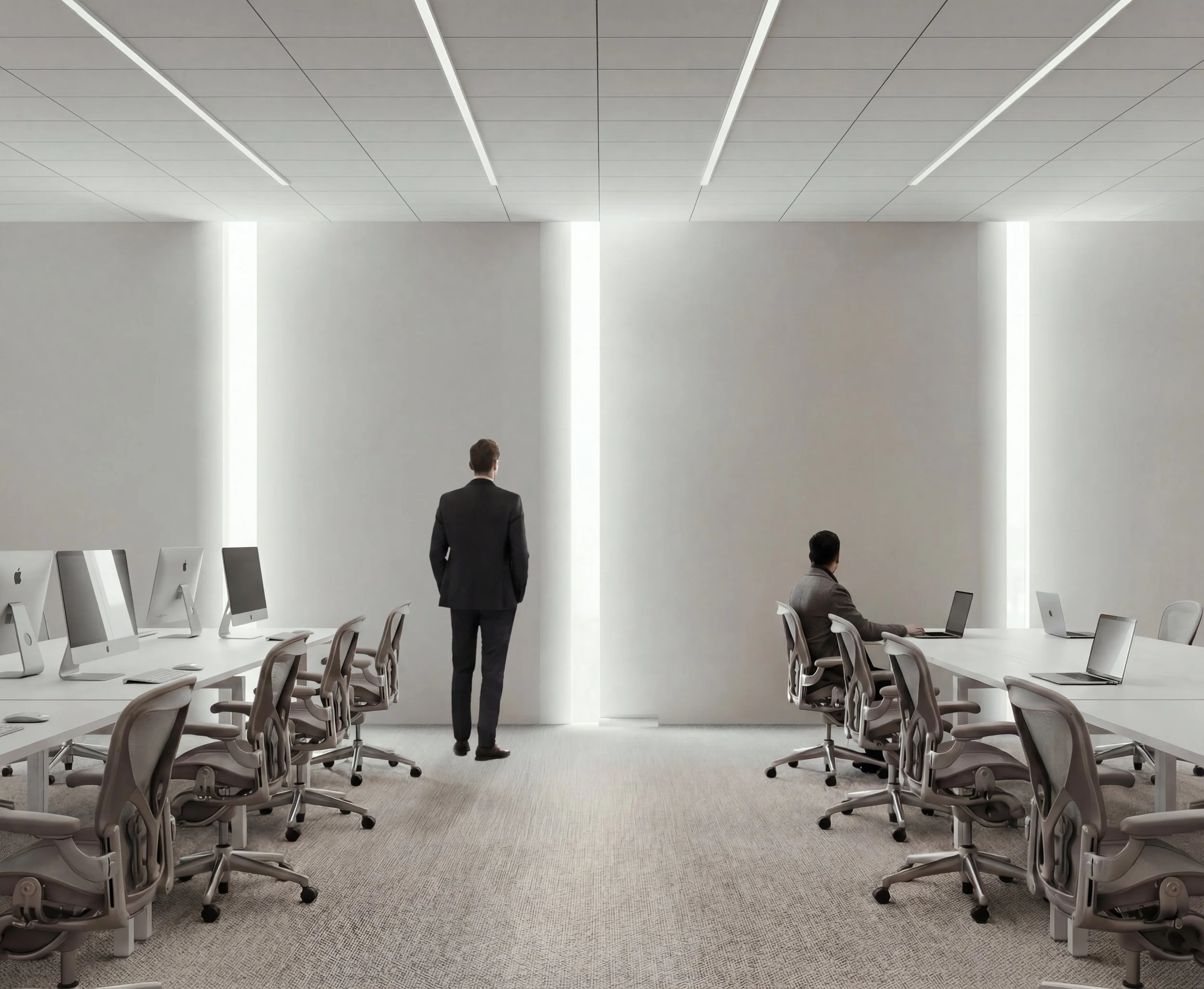 In place of a fully glazed façade, the GFRC envelope operates as a large-scale optical filter. Facade elements, rhythmically arranged according to orientation, and an optimized window-to-wall ratio transform harsh direct sunlight into soft, diffuse illumination, gently distributing natural light into the interior. Deeply recessed openings secure daylight and views while simultaneously ensuring privacy and thermal performance. Transparency, therefore, is not conceived as indiscriminate openness, but as a precisely calibrated condition.