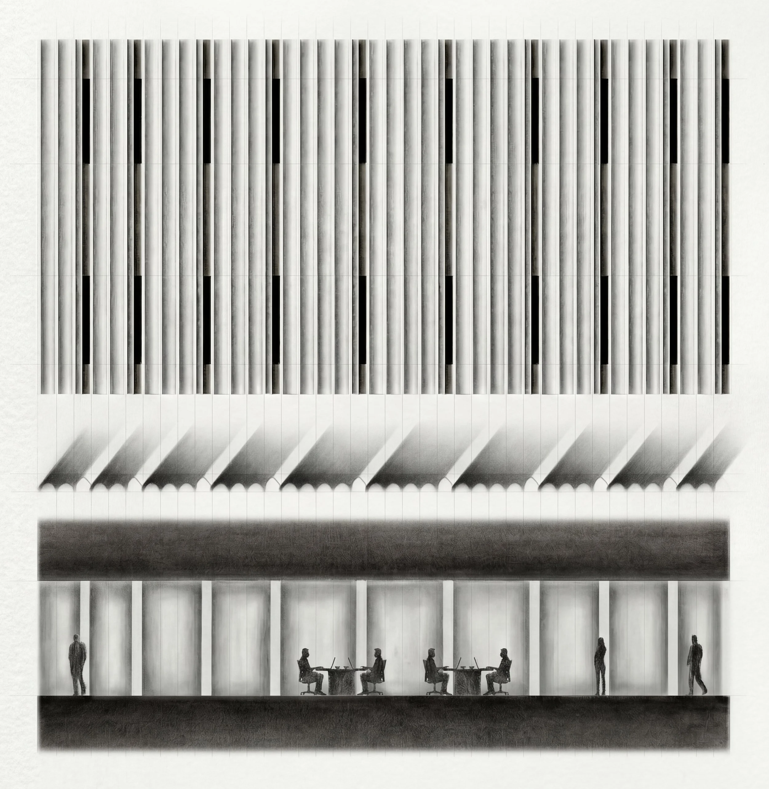 Separate blinds are no longer necessary. Shading is not an applied accessory but is internalized within the architectural form itself, operating like a finely tuned, ancient mechanical device embedded in the building’s geometry. This approach minimizes maintenance demands while generating a richly articulated façade whose expression continuously shifts with the movement of the sun. The building acquires a differentiated identity across day and night, time and season.