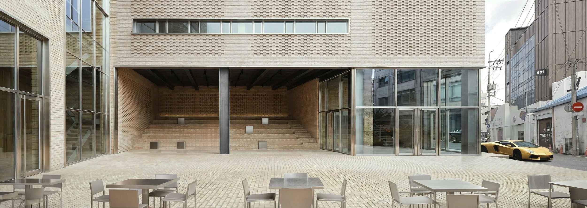 생산의 장소였던 공장은 지역의 기억을 보존하는 동시에, 사람들의 만남과 체류, 일상과 문화가 교차하는 도시적 관계의 장으로 재구성된다. 지상층의 열린 광장과 필로티 아래 마련된 계단식 좌석은 길을 지나던 이들이 자연스럽게 체류하는 공유의 공간이자, 때로는 버스킹과 대화가 이루어지는 소규모 극장으로 기능한다. 외부의 벽돌 바닥재는 내부로 연장되어 공간적 경계를 흐리며, ‘도시의 거실(Urban Living Room)’로서 보행자를 상층부의 문화 프로그램으로 연결한다. 영롱쌓기로 구성된 입면은 벽돌 사이로 빛과 시선이 스며들도록 하고, 그 사이에 배치된 통유리창과 스테인리스 스틸 프레임은 물성을 통해 산업 건축 재생의 정체성을 명확히 드러낸다.