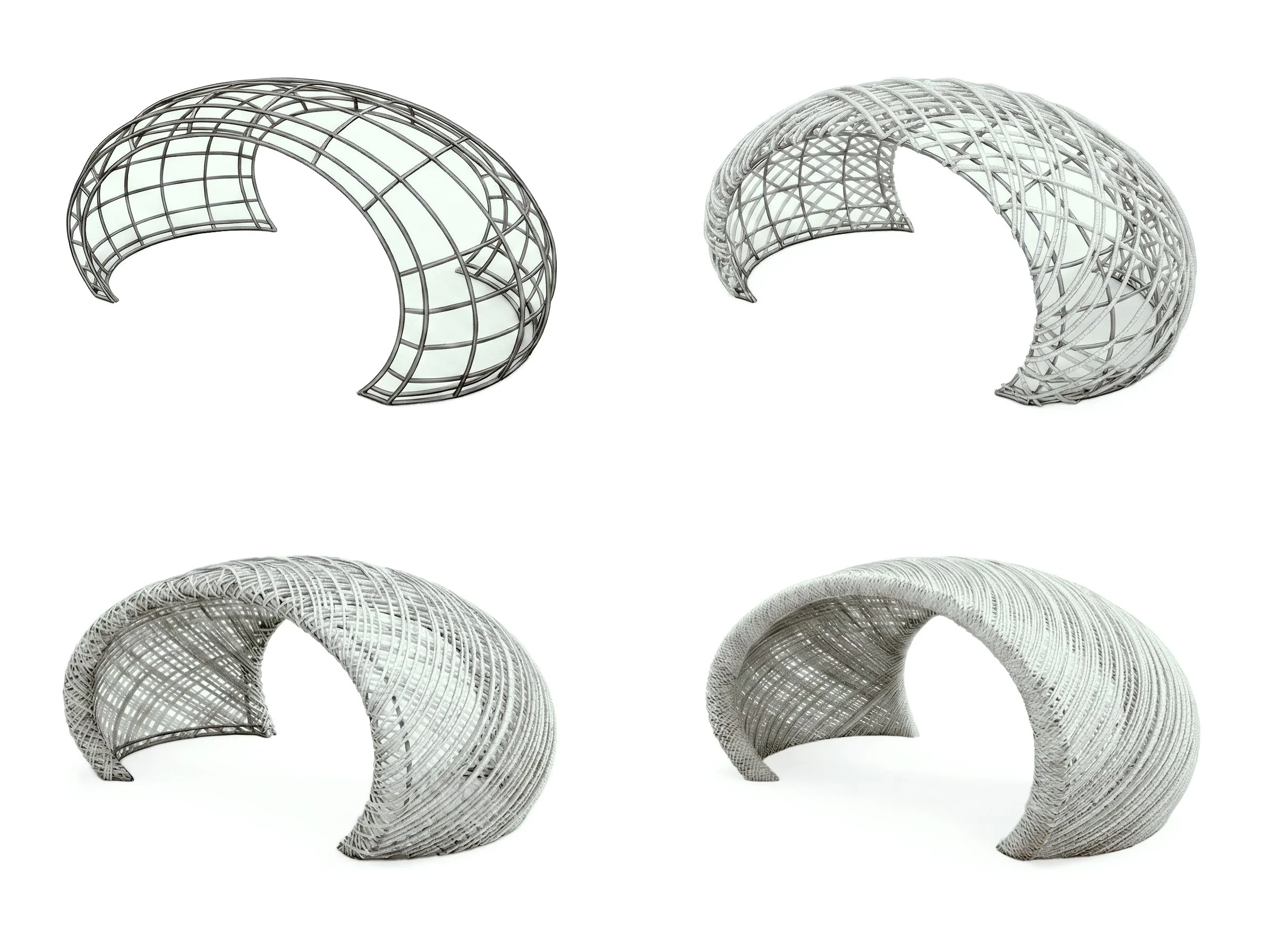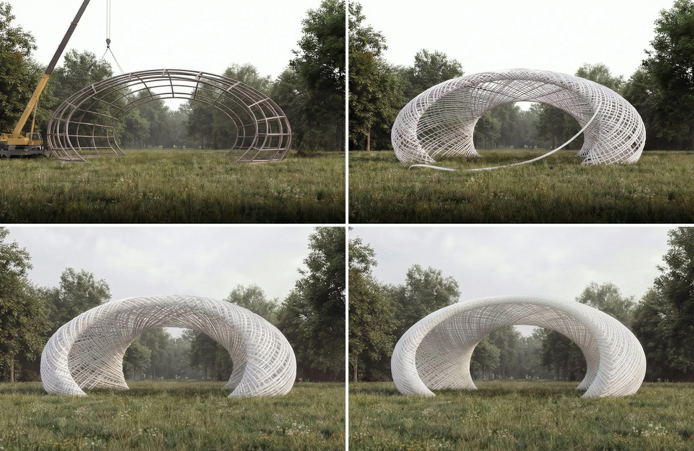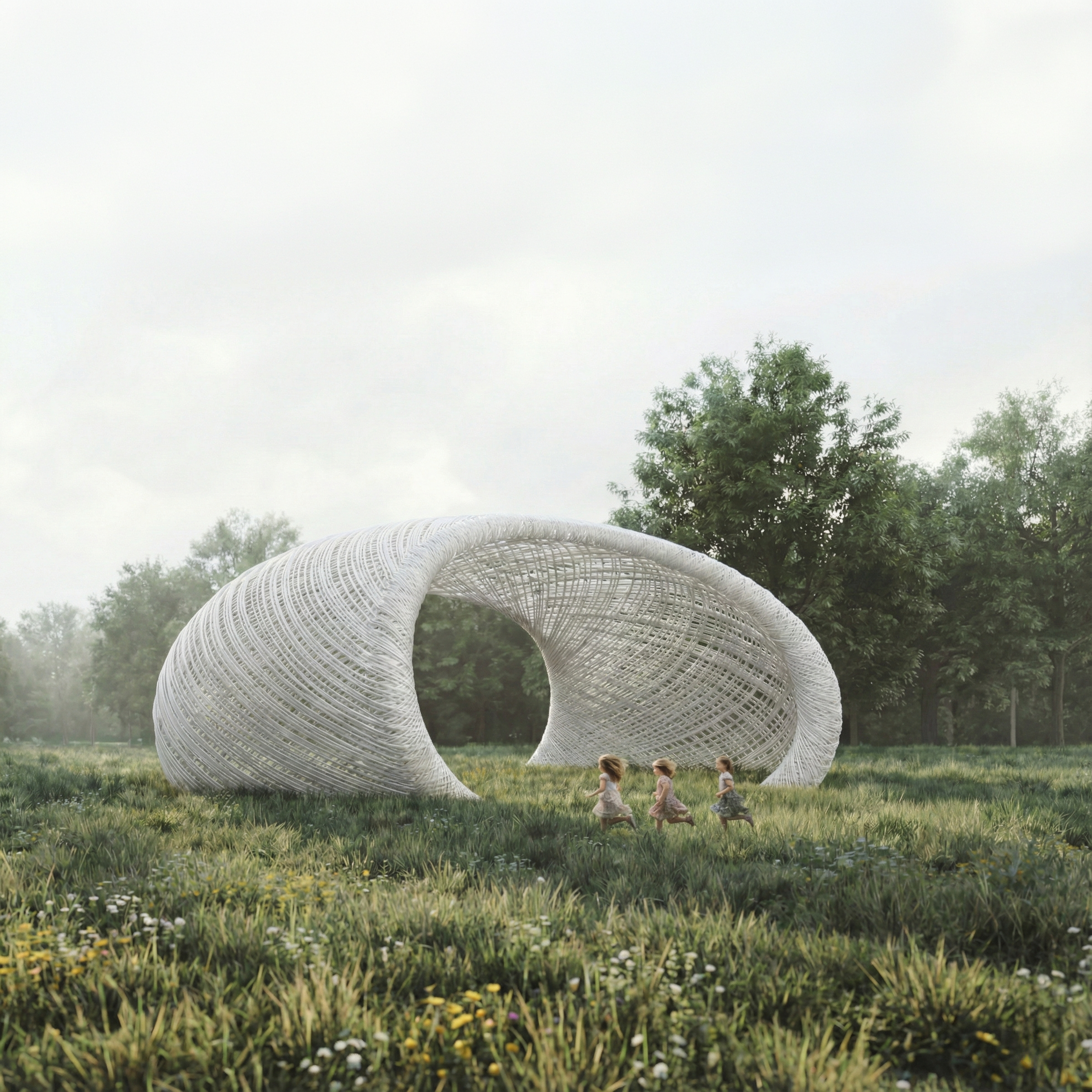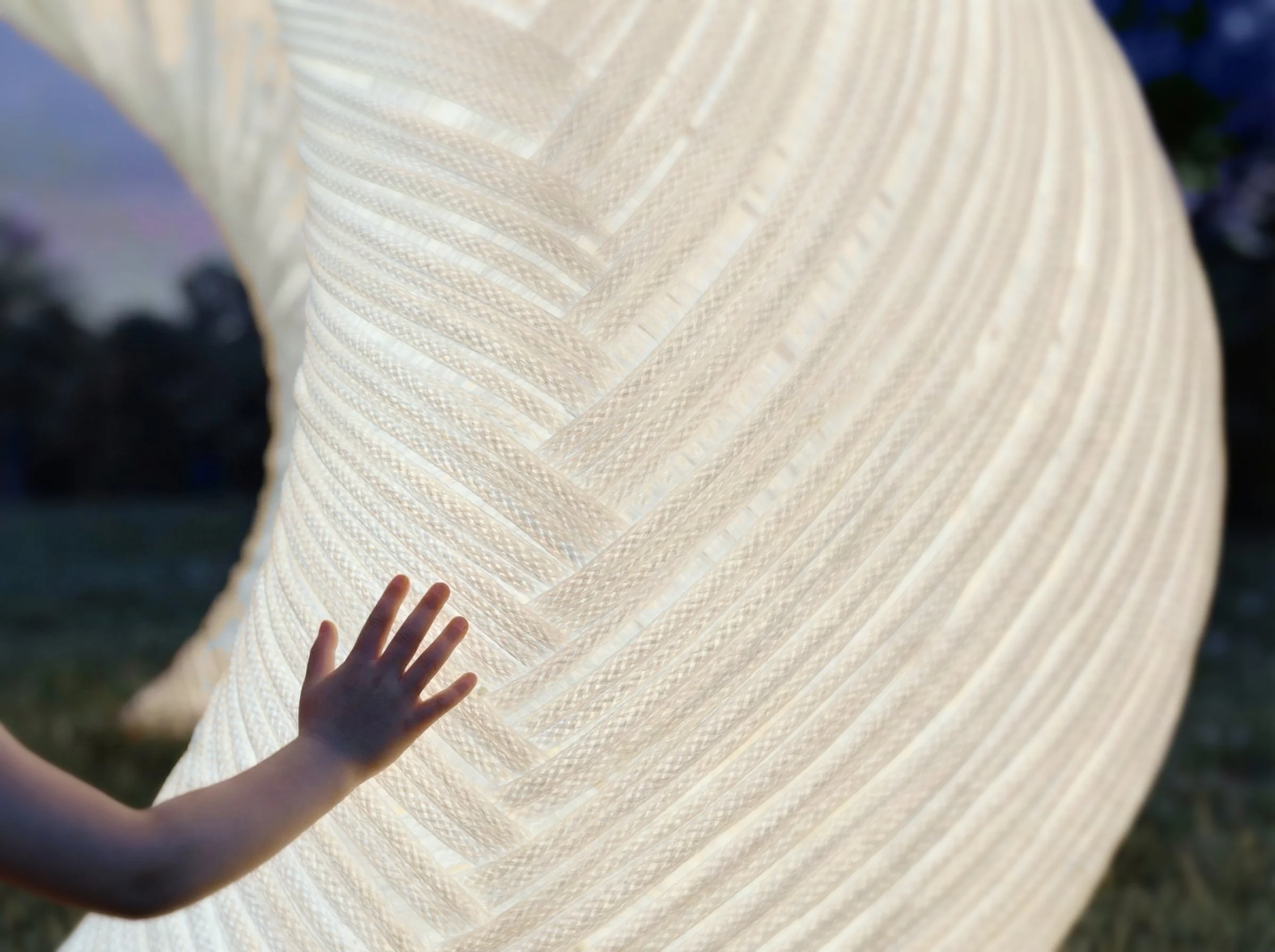 Luminous Skein is an ontological device situated at the threshold between architecture and nature, structure and sensation. A continuous strand of fabric braided translucent LED hose wraps around the steel frame like a woven skein, forming a 'luminous skin.' It exists not as a fixed object, but as a fluid state that constantly varies in response to its environment. Its porous envelope simultaneously admits and transmits light, wind, and gaze, dismantling the binary distinction between interior and exterior. Here, a boundary operates not as a line of separation, but as a relationship that generates interaction.