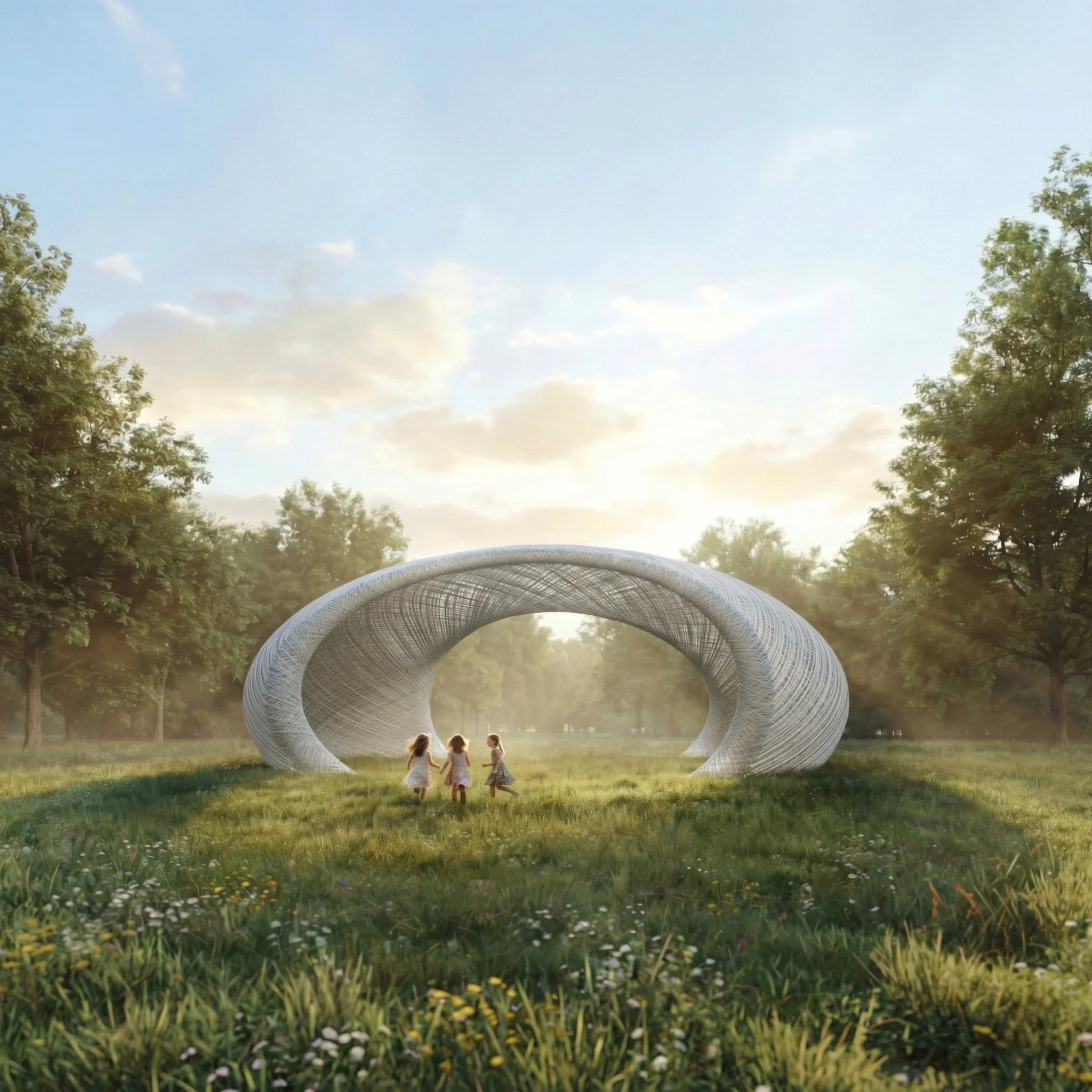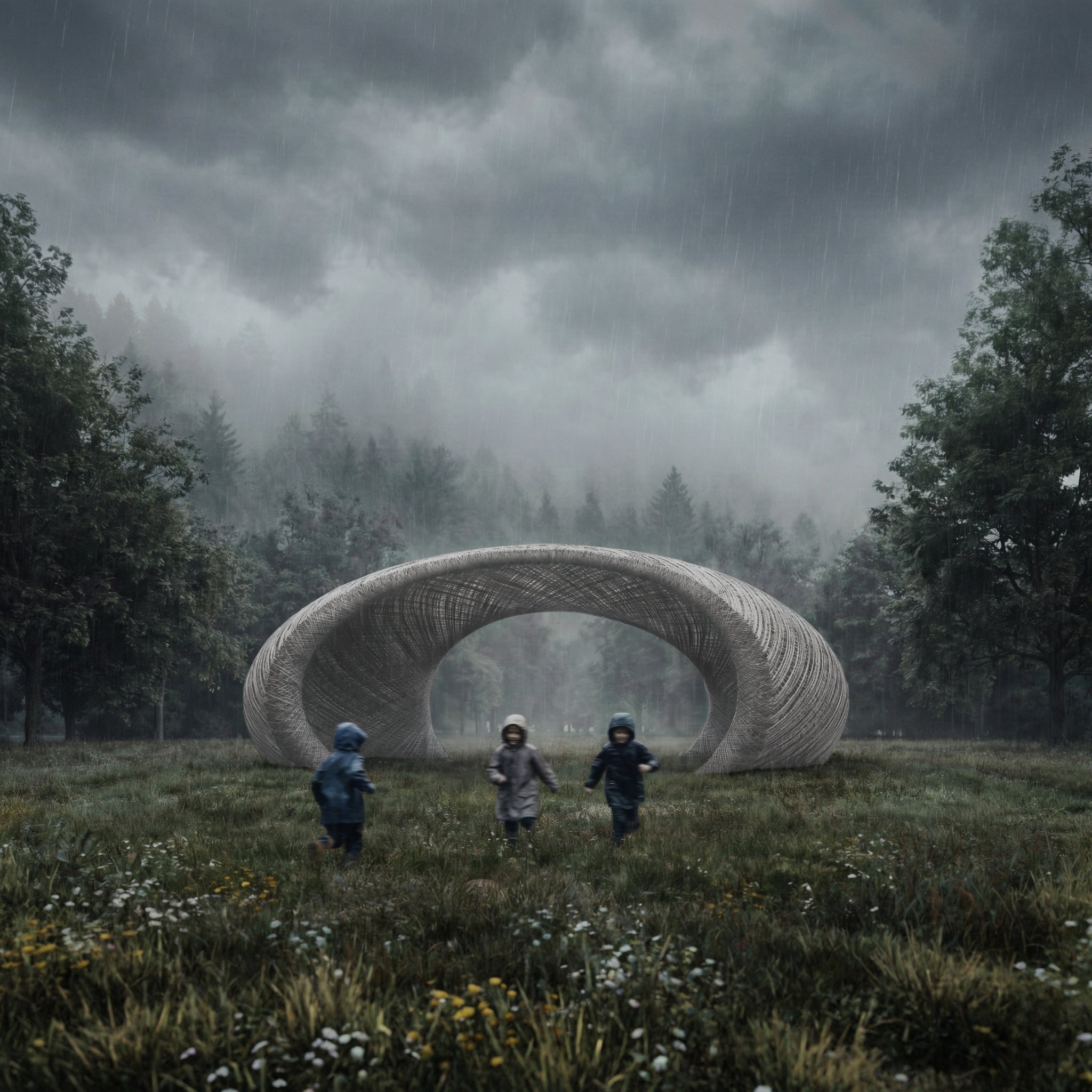 Upon entering the curved interior, visitors step beyond physical space into a condensed density of sensation. Light flows without stagnation, and shadows vibrate subtly like the breath of the structure. Time is perceived not as a linear flow, but as an accumulation following the rhythm of nature. The structure functions not merely as a passive background, but as an active apparatus that continuously mediates between human existence and the surrounding environment.